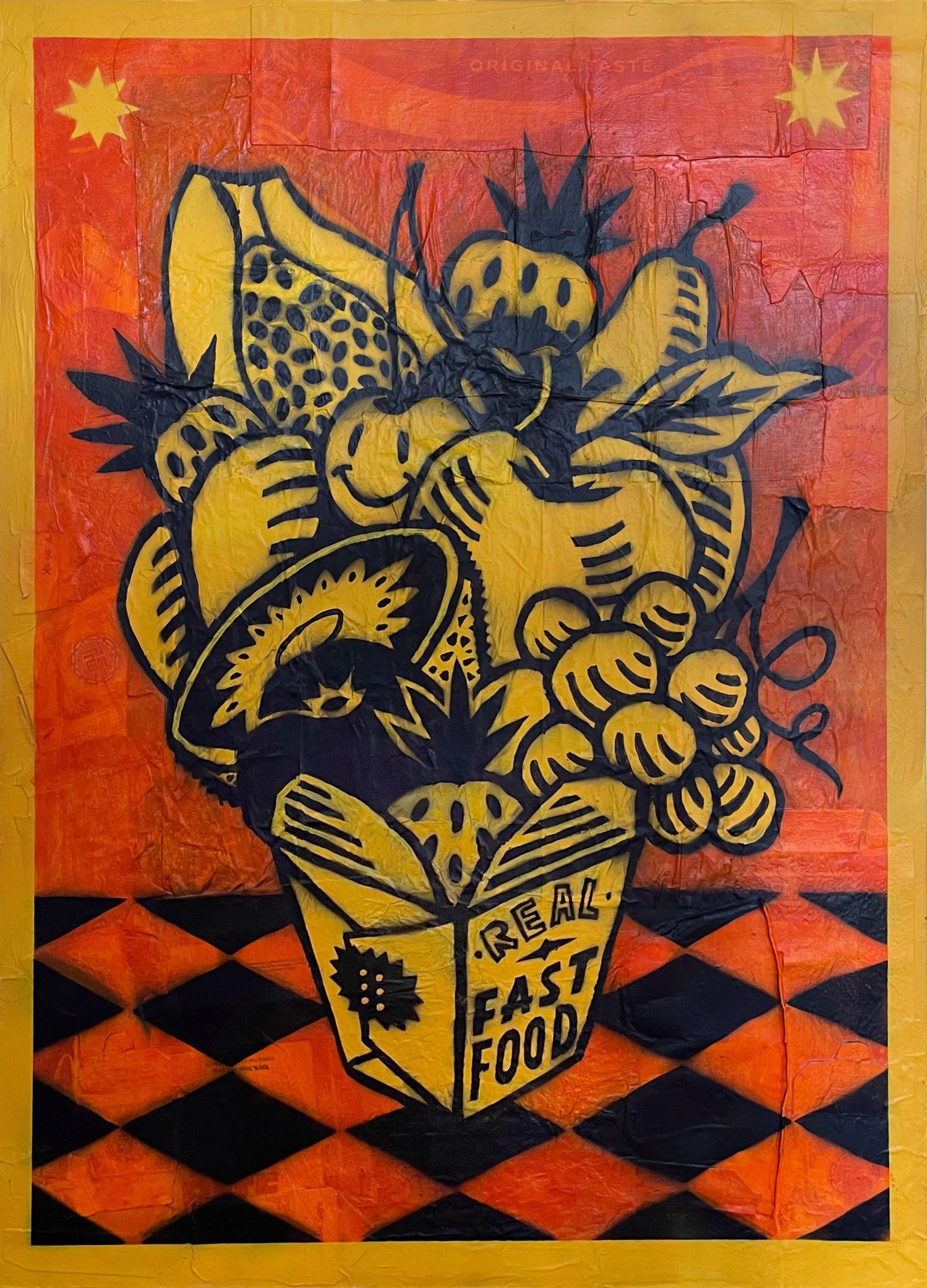 "Comida Rápida" - Mixed media over recycled fast food packaging on canvas, 80x110cm, 2025.